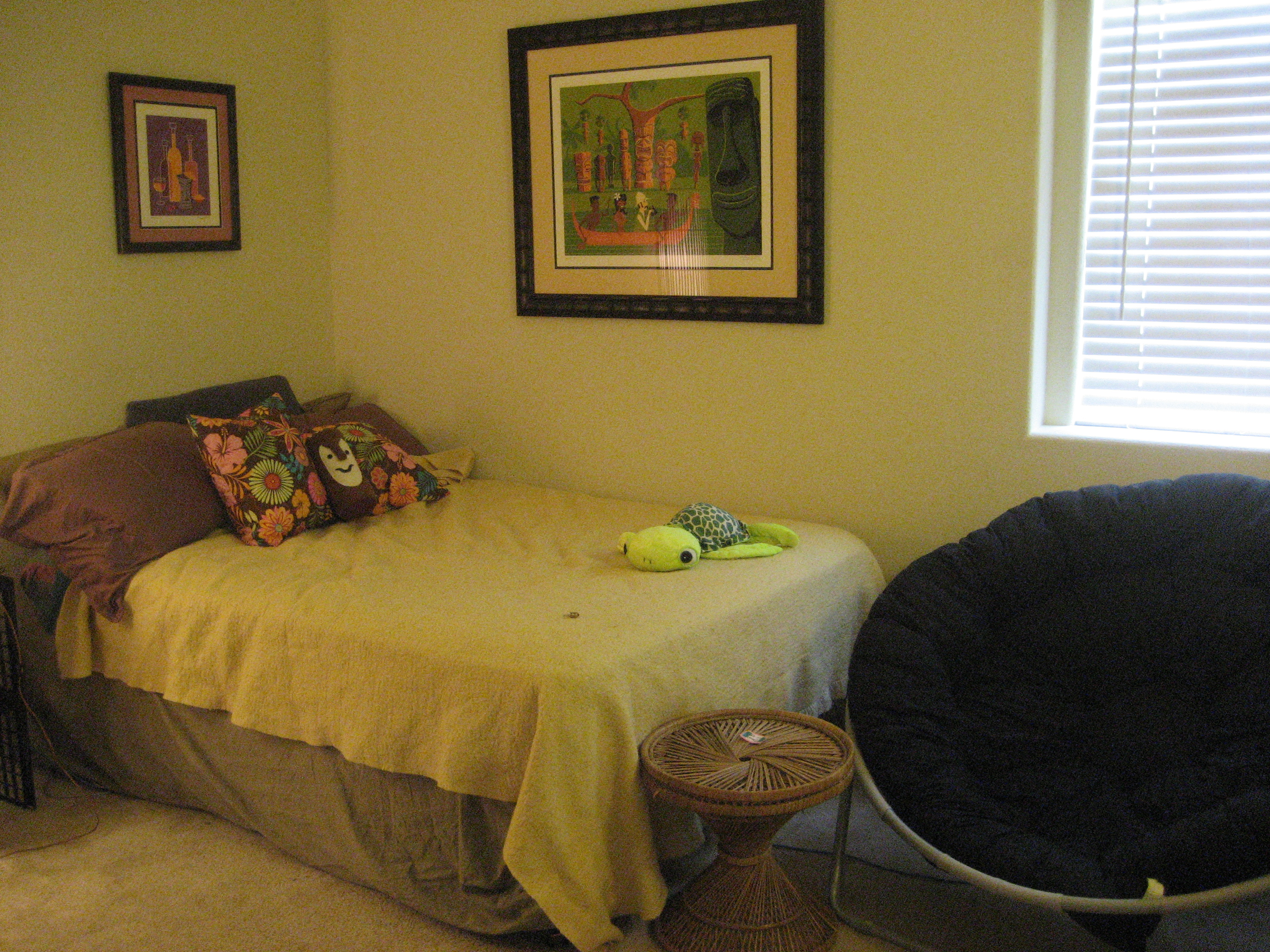 I think it would be fun to turn them into lamps, but if I don’t end up getting motivated I can always use them for their originally intended purposes (mini side table and trash can). Here’s what one of the pieces looks like in my in-progress tiki room. Yeah, I have white walls…deal with it! 😉