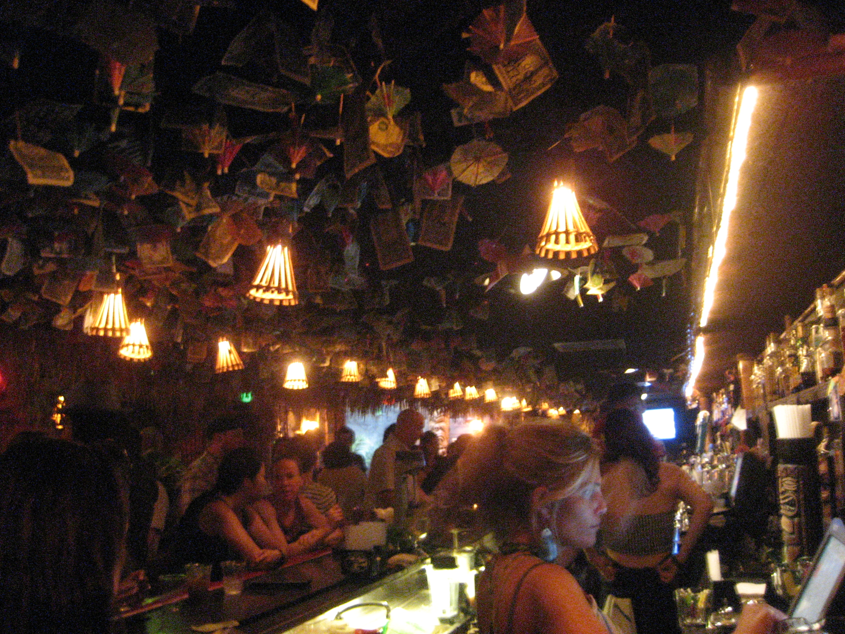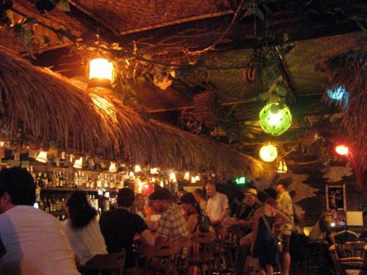 Dollar bills and drink umbrellas dot the thatched hut’s ceiling inside, and according to their FAQ: “It started as a local tradition soon after we opened, and has been going strong ever since. In WWII, sailors shipping out to the Pacific would leave a dollar at their local bar to get a drink when they got back. Don’t forget to leave a message on them!”