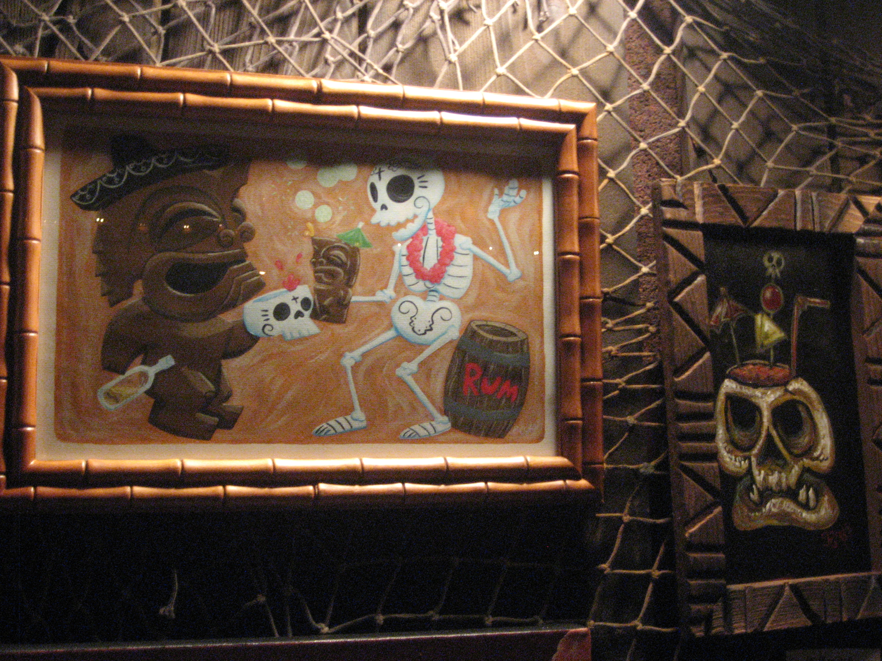 Eric October has a knack for making tikis look cute, like this happy Ku toasting a Dia de Los Muertos figure. And I love how the scrap wood frame looks with Kirby’s “Skully Brains Cocktail” on the right.