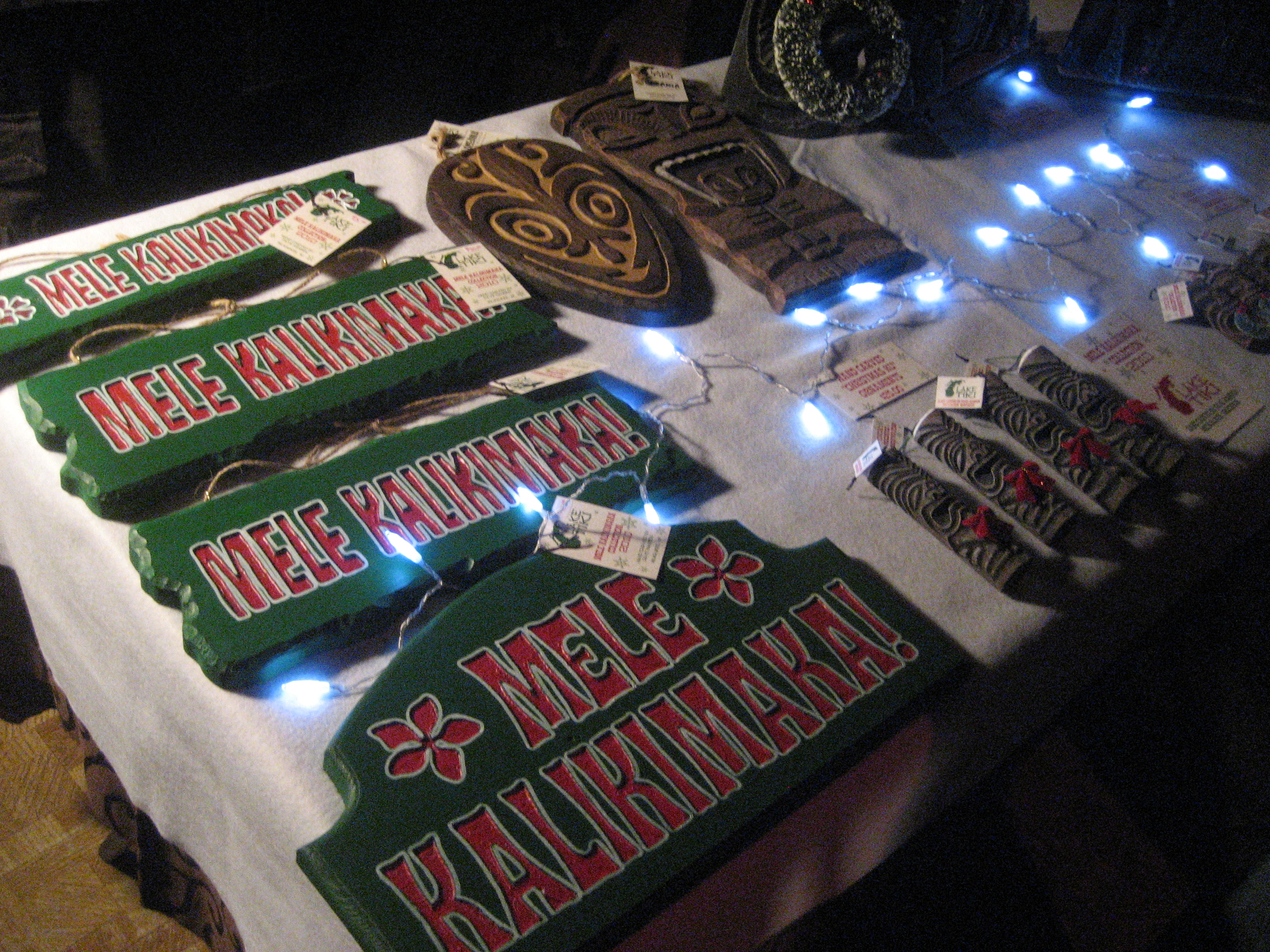 Lake Surfer (who hails from Wisconsin, hence the alias) had these very cool carved Mele Kalikimaka signs, and I snapped one up for the tiki room, along with a tiki ornament. I can’t help but adore tiki-holiday mashups.
