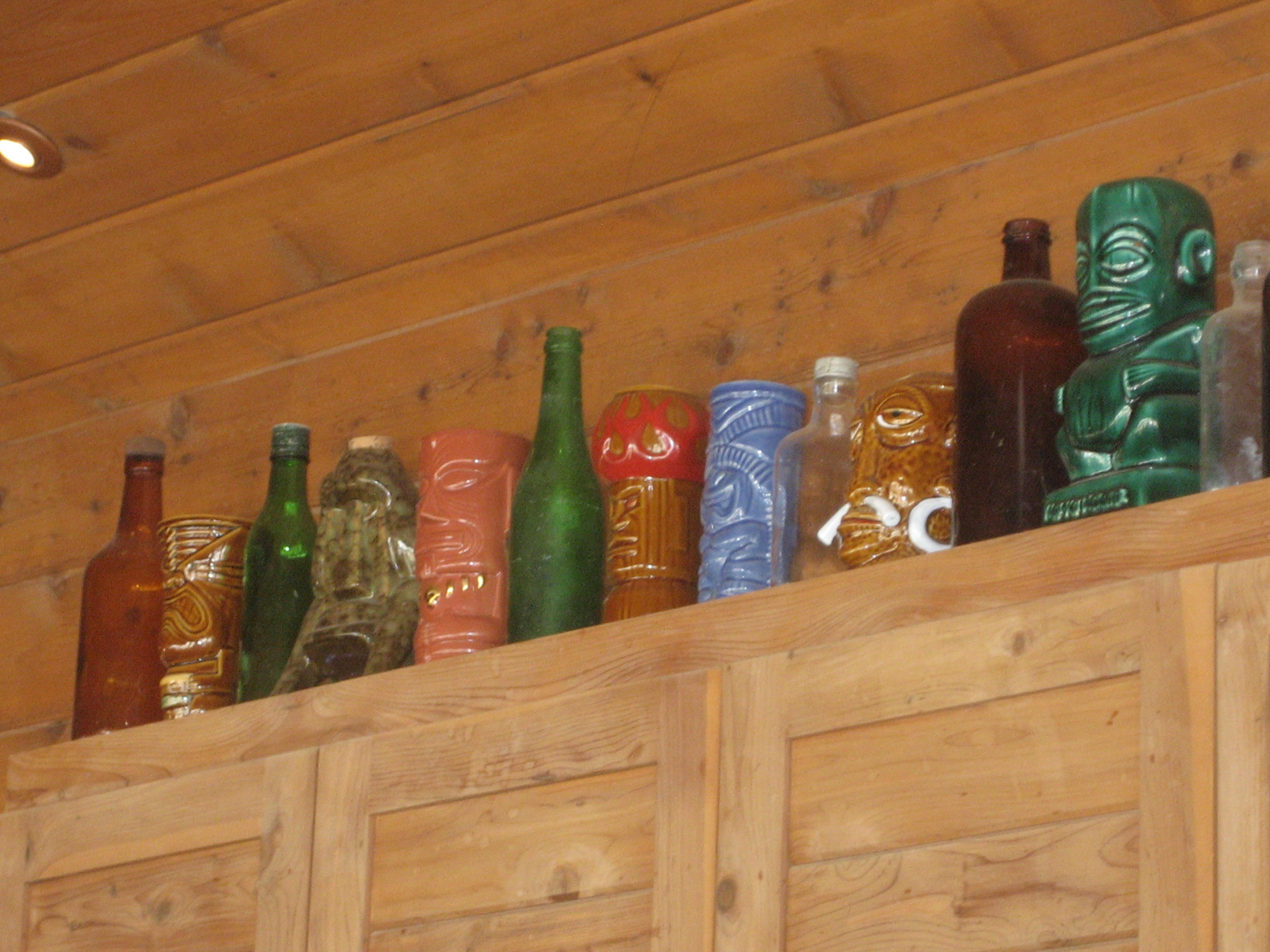 I also like how vintage-looking Prohibition bottles were mixed among the tiki mugs. (Also, I think we could start playing a tiki version of “Where’s Waldo?” Except it would be “Where’s Mr. Bali Hai?”)