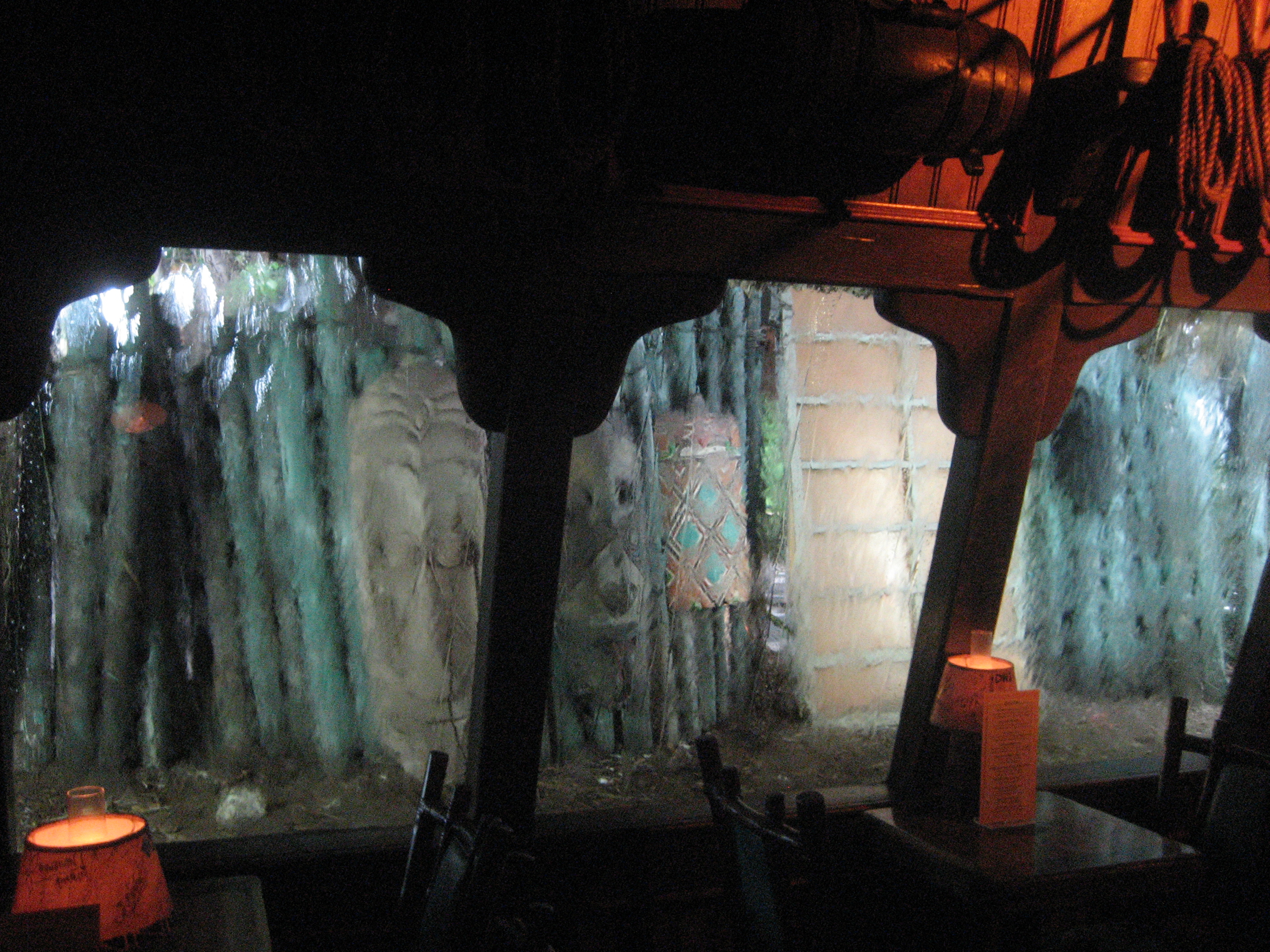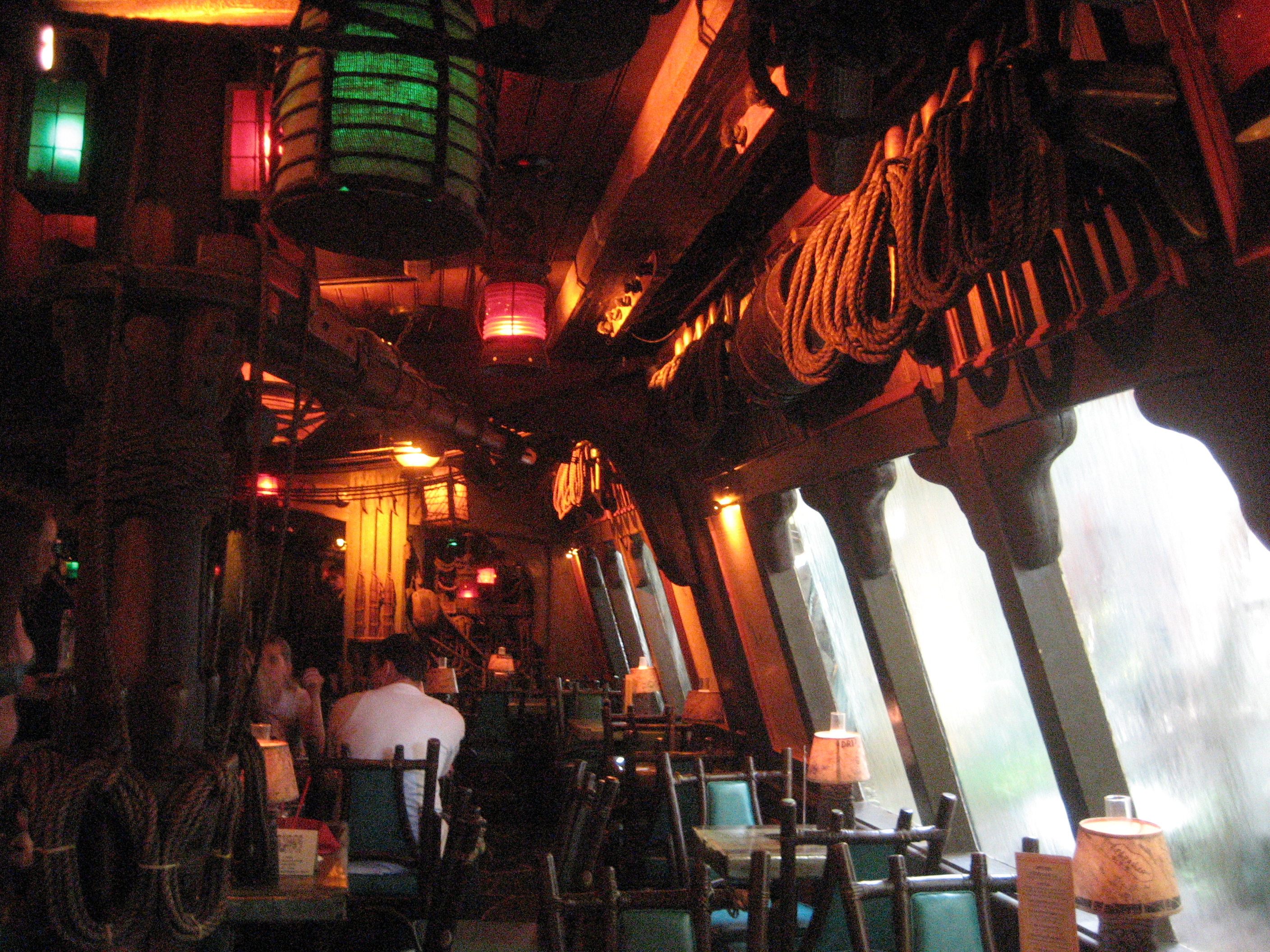 There’s a lovely stained glass mermaid mural, plus neat little details like gold doubloon-type coins inlaid in the tables. Looking up, you’ll notice jagged cut-outs in the wood plank ceiling to reinforce the shipwreck setting.