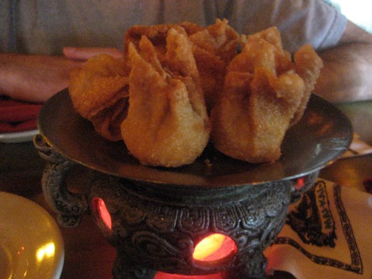 We also ordered the won ton soup ($3.25) and my favorite Polynesian app: crab rangoon ($4.75) flavored with cheese and curry and served with barbecue, sweet and sour and hot mustard. There’s lots of other fried delights, including intriguing things called Tahitian cheese tangs, plus oysters Rockefeller and even escargots.