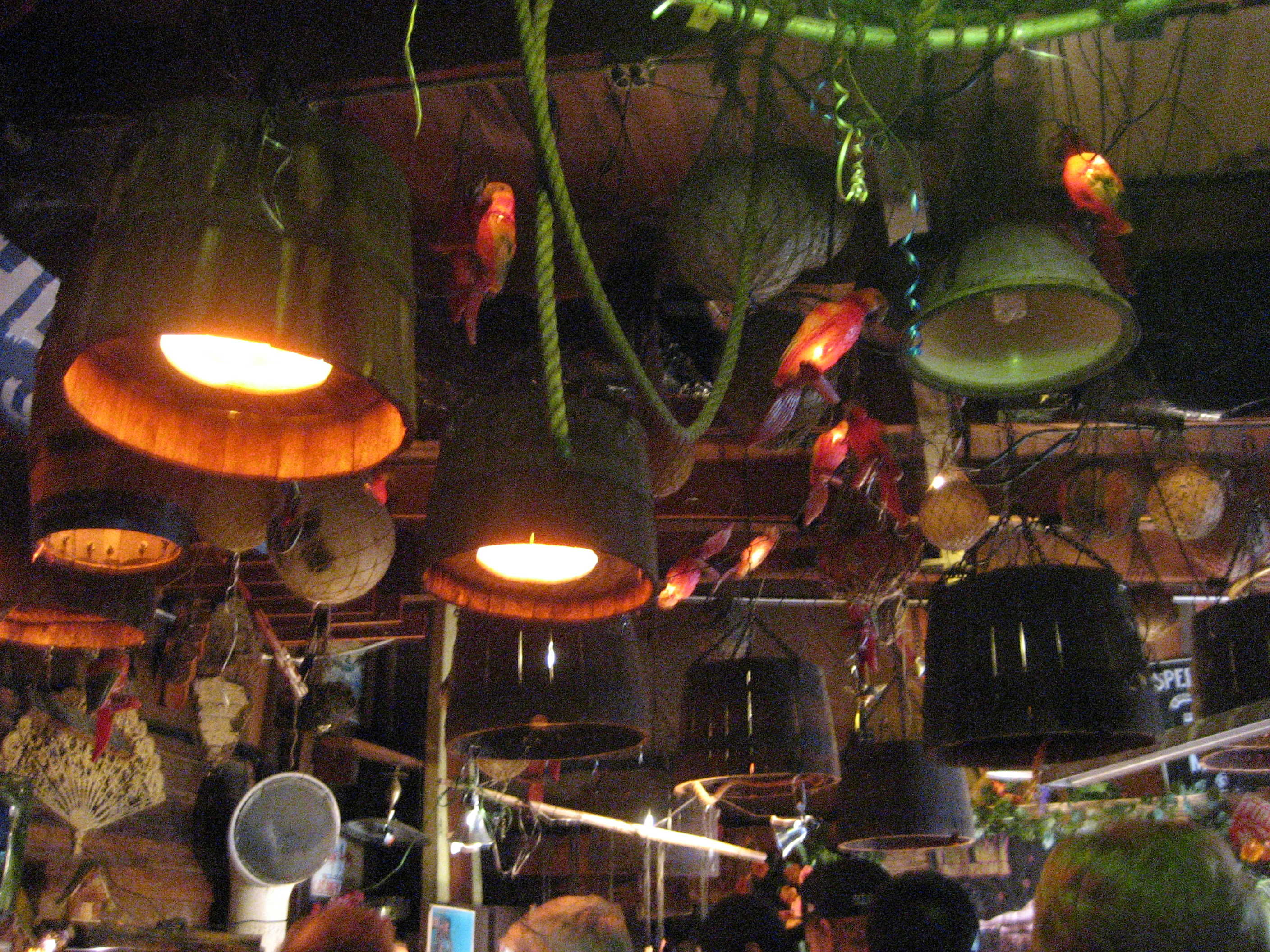 This is also where visitors first encounter Shag’s series of tributes to those jungle pin-ups, each posed with a wild animal and a “spirit mask.” (I’m guessing they weren’t called “tikis” since they’re not in a Polynesian environment?)